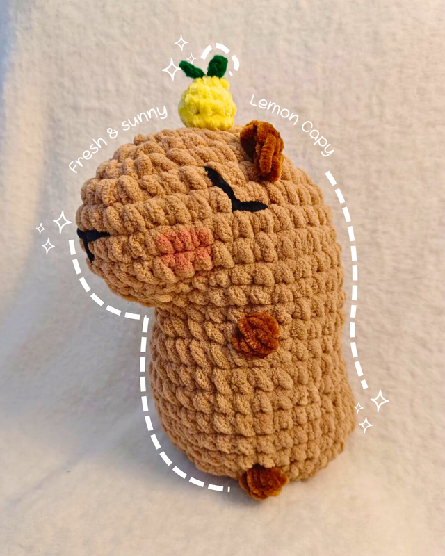 Meet the Fruity Capy plushies by Giti Studio! Orange and Lemon are handmade with soft Baby Blanket Yarn and filled with hypoallergenic stuffing for ultimate coziness. Adorned with safety embroidery eyes, these adorable plushies stand 28-29cm tall and are perfect for home decor or as a comforting companion. Orange exudes calmness, Lemon brings brightness - choose your fruity vibe to brighten your day! With their cheeky bums and cute design, these Crochet Capybaras are sure to bring smiles and giggles wherever they go. Adopt Orange or Lemon today for a touch of joy in your space!